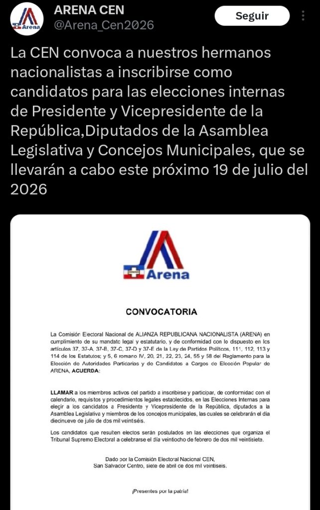 Con esta convocatoria, ARENA inicia formalmente su proceso de organización interna de cara a las próximas elecciones generales, en un contexto político en constante evolución en el país.