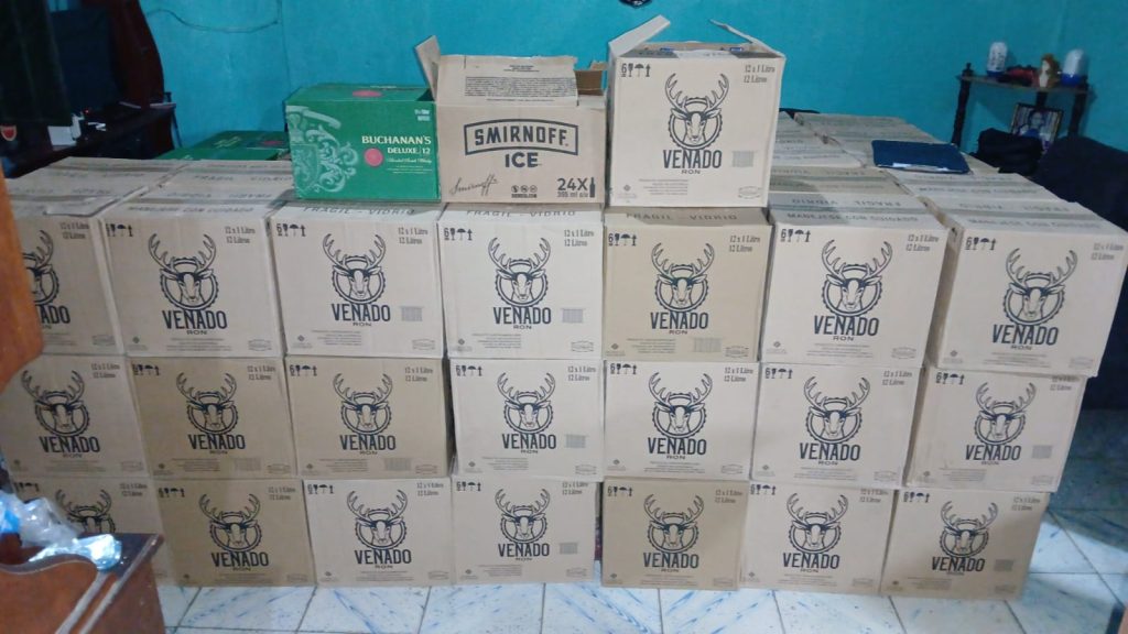Durante el procedimiento realizado en la vivienda del sospechoso, las autoridades incautaron 114 cajas con bebidas alcohólicas nacionales e internacionales, así como 1,380 dólares en efectivo, presuntamente relacionados con la comercialización del producto.