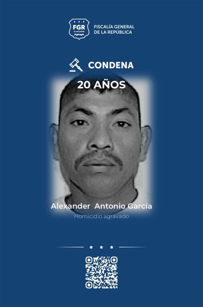 San Salvador, El Salvador. — La Fiscalía General de la República (FGR) informó que Alexander Antonio García fue condenado a 20 años de prisión por su responsabilidad en un homicidio ocurrido en octubre de 2013 en el municipio de Jiquilisco.