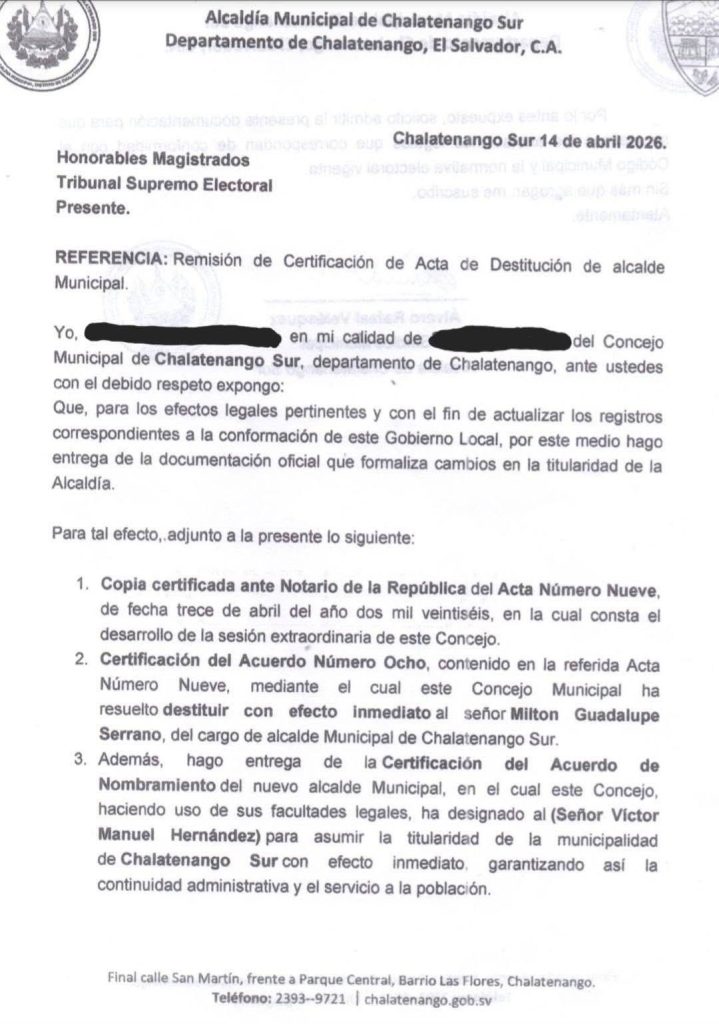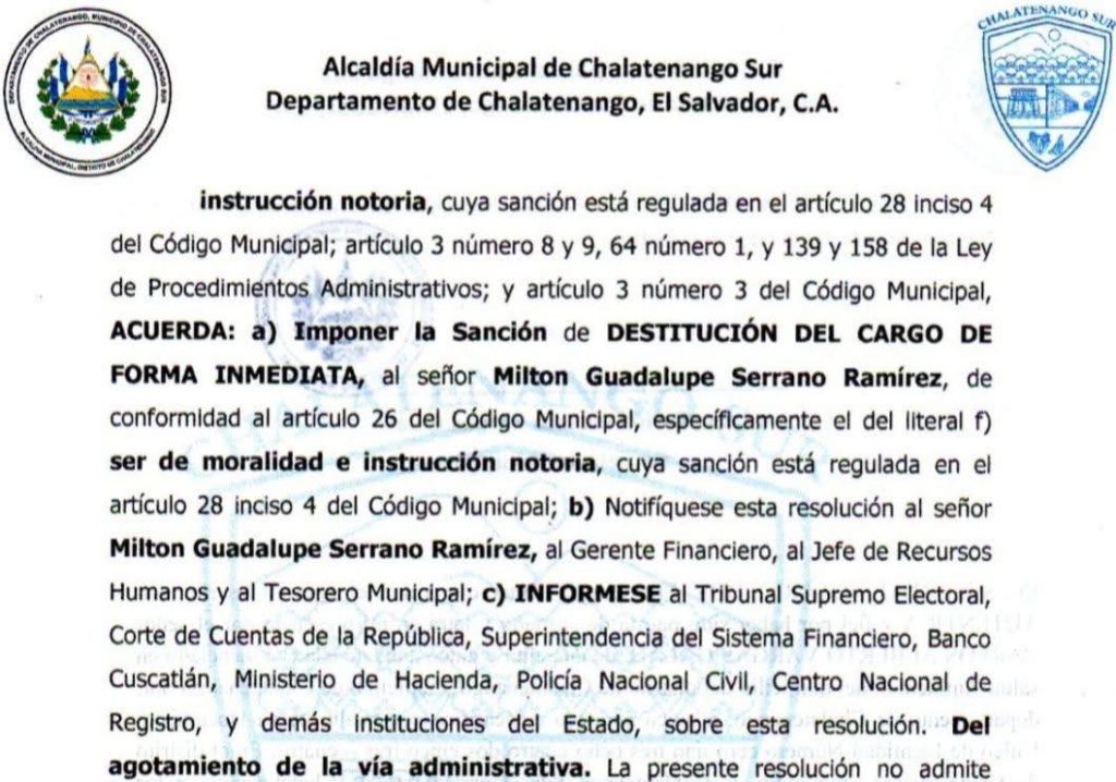 Chalatenango Sur. — El Concejo Municipal oficializó la destitución inmediata del alcalde Milton Guadalupe Serrano Ramírez, miembro del Partido de Concertación Nacional (PCN), tras determinar la comisión de faltas administrativas muy graves durante su gestión.