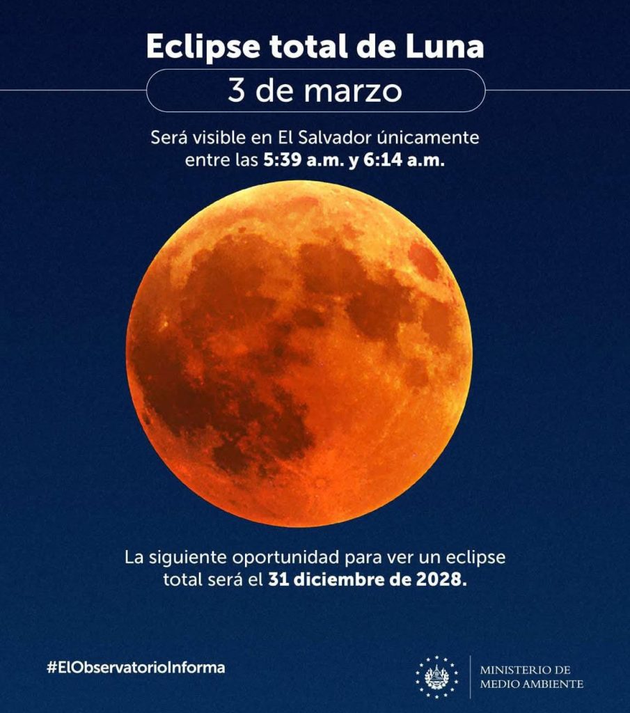El Ministerio de Medio Ambiente y Recursos Naturales informó que este 3 de marzo se registrará un eclipse total de Luna, un fenómeno astronómico que podrá observarse en territorio salvadoreño durante un periodo limitado.
