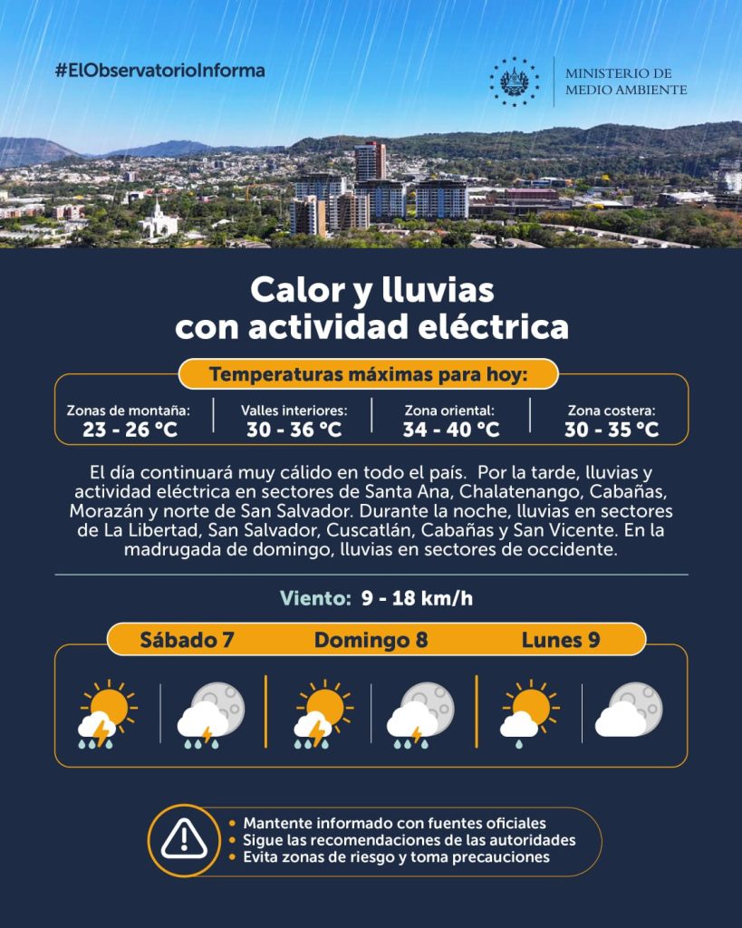De acuerdo con el reporte meteorológico, el ambiente se mantendrá caluroso en diferentes zonas del país. No obstante, también se prevé la posibilidad de lluvias acompañadas de actividad eléctrica en varios sectores, entre ellos San Salvador y La Libertad.