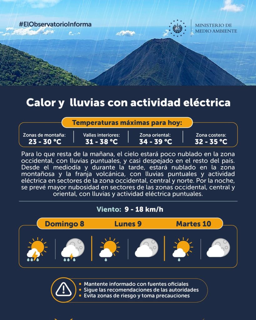San Salvador, El Salvador. — El Ministerio de Medio Ambiente y Recursos Naturales (MARN), a través de su Observatorio, informó que para este domingo se prevé un ambiente caluroso en gran parte del país, acompañado de cielo nublado y lluvias puntuales en diferentes regiones.