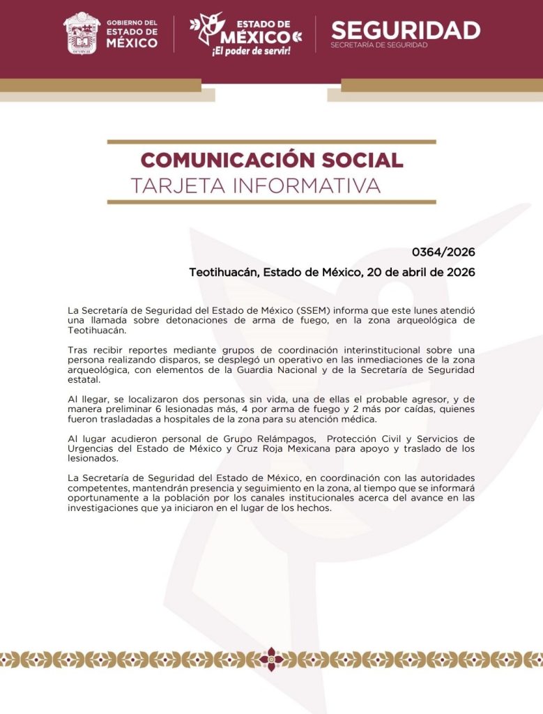 Autoridades desplegaron un operativo en la zona para controlar la situación y garantizar la seguridad de los visitantes. En el sitio trabajan equipos de la Guardia Nacional, así como de la Secretaría de Seguridad y Protección Ciudadana y la Fiscalía General de Justicia del Estado de México, quienes mantienen acordonada el área mientras avanzan las investigaciones.