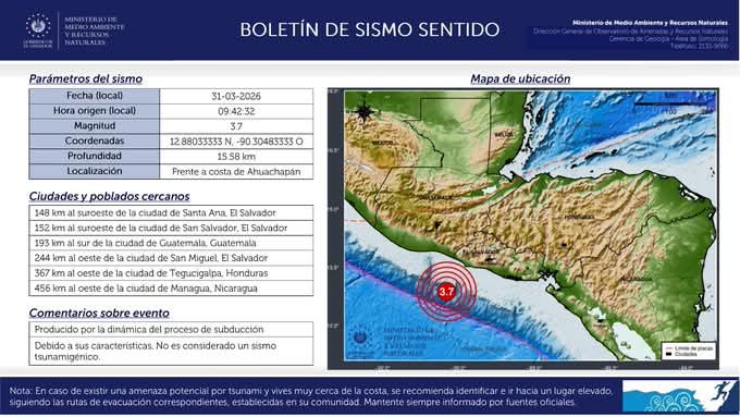 Ahuachapán, El Salvador. — El Ministerio de Medio Ambiente y Recursos Naturales informó sobre un sismo de magnitud 3.7 registrado frente a la costa del departamento de Ahuachapán.